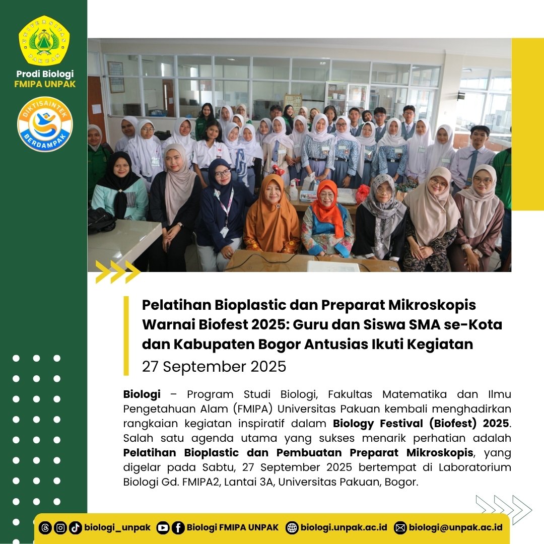 Pelatihan Bioplastic dan Preparat Mikroskopis Warnai Biofest 2025: Guru dan Siswa SMA se-Kota dan Kabupaten Bogor Antusias Ikuti Kegiatan Admin Berita 06 October 2025 Mahasiswa Biologi UNPAK Ikuti Belantara Learning Series Episode 13 (BLS 13), Perkuat Konservasi Orangutan Tapanuli Admin Berita 16 September 2025 PPK Ormawa HMB Helianthus Gelar Pelatihan Digitalisasi dan Pemasaran Produk Lokal di Desa Parakan Admin Berita 08 September 2025 Monitoring Produk Olahan TOGA, Tim PPK Ormawa HMB-Helianthus Dukung Kemandirian Warga Desa Parakan Admin Berita 08 September 2025 Mahasiswa Baru PS. Biologi FMIPA UNPAK Ikuti PKKMB 2025, Awali Perjalanan Akademik dengan Semangat Kolaborasi Admin Berita 17 September 2025 YIARI dan Prodi Biologi FMIPA Universitas Pakuan Gelar Kuliah Umum Konservasi Macaca, Dorong Minat Riset Mahasiswa Admin Berita 16 September 2025 Monitoring Budidaya TOGA: Mahasiswa Biologi UNPAK Dampingi Warga Desa Parakan Admin Berita 08 September 2025 Alternatif Pengobatan Mandiri: Mahasiswa Biologi UNPAK Latih Warga Ciomas Budidaya Tanaman Obat Keluarga Admin Berita 08 September 2025 12345678910
